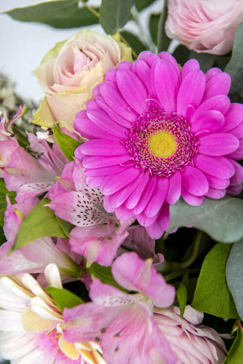 Bouquet rosa e bianco con roselline, gerbere e lisianthus