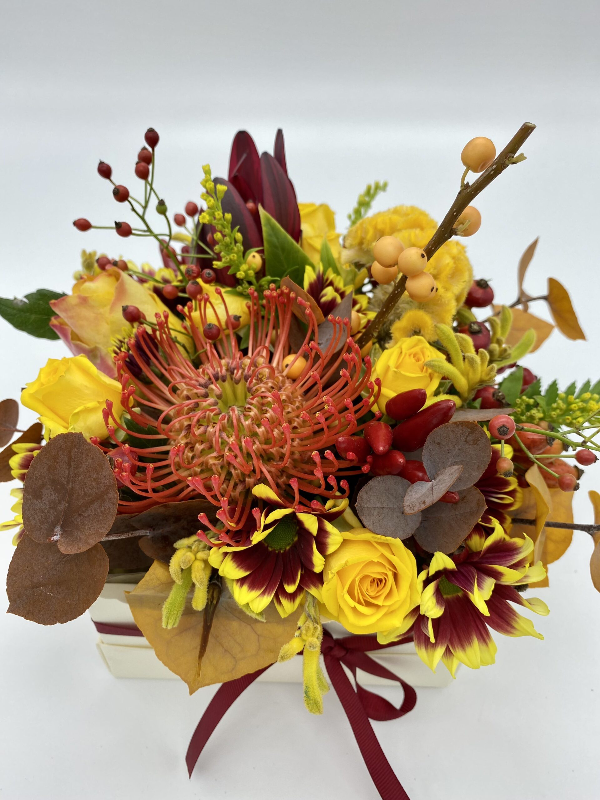 Questo cestino che riprendi i colori autunnali è composto interamente da fiori freschi ed è la decorazione perfetta per la vostra casa o il vostro ufficio.
