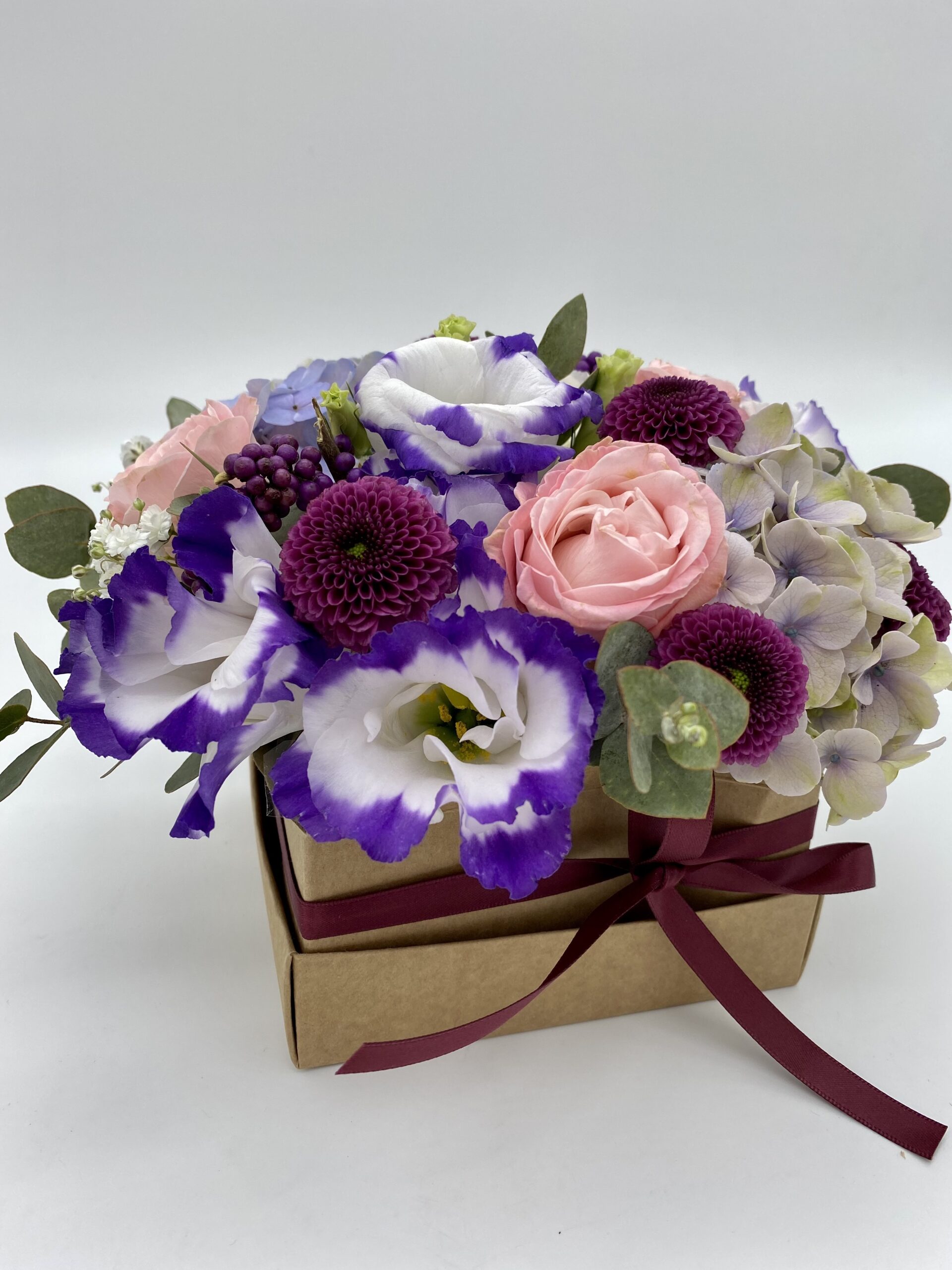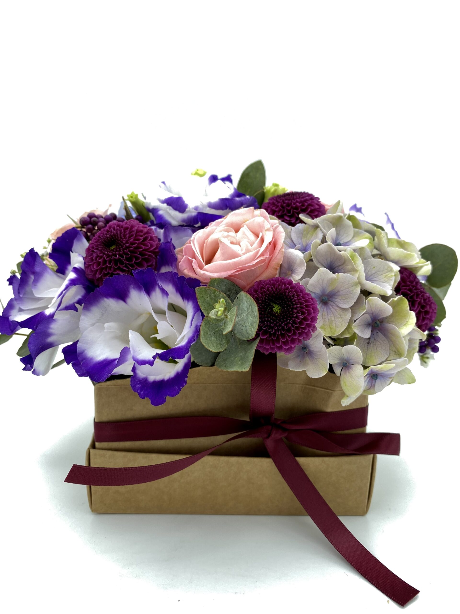 Cestino con fiori freschi rosa e lilla perfetti per aggiungere un tocco di colore alla vostra casa o il vostro ufficio.