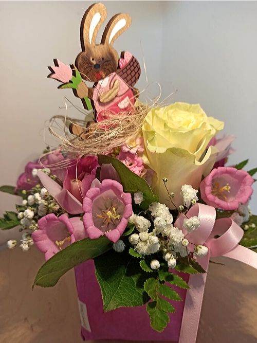 Bouquet rosa e bianco con roselline, gerbere e lisianthus